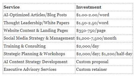 Per-word rates reflect content complexity, research requirements, and AI optimization level. Investment includes up to two revision rounds; additional revisions billed at $150/hour.